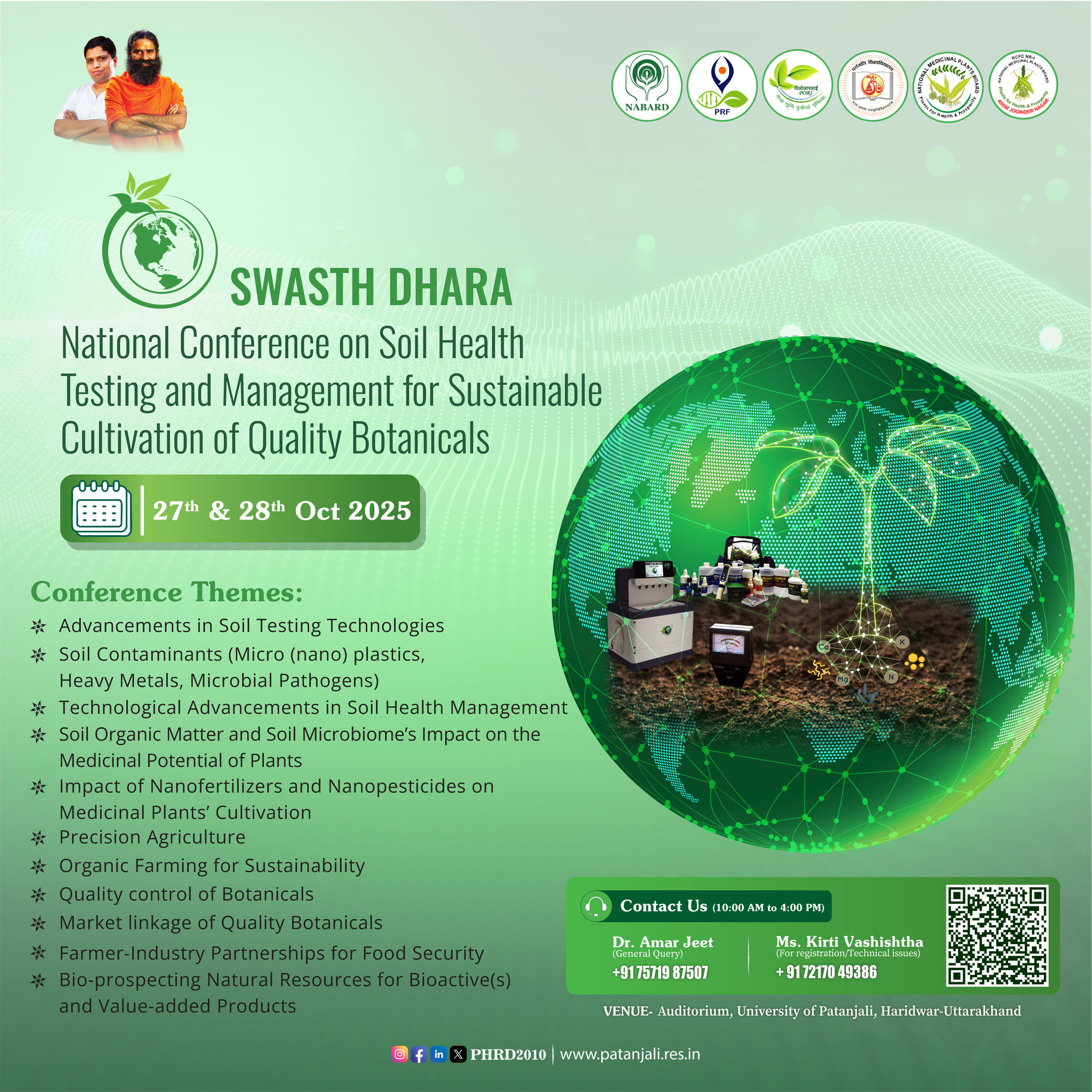 The Two-day National Conference on Swasth Dhara - Soil Health Testing and Management for Sustainable Cultivation of Quality Botanicals, scheduled on 27–28 October 2025, will be held in Haridwar in a hybrid format, featuring both offline and virtual sessions. Sponsored by NABARD, it is jointly organized by the Patanjali Research Foundation, Patanjali Organic Research Institute Pvt. Ltd., University of Patanjali and RCFC NR-1, NMPB, Ministry of Ayush.